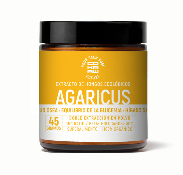 Extracto puro de Agaricus (Agaricus blazei murill) ecológico con doble extracción. Ratio 10:1, >30% beta-glucanos. Cuerpo fructífero 100%. Origen: Shangri-la, China.