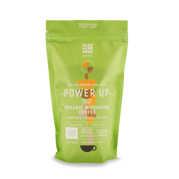 Café ecológico con Cordyceps, Reishi y Shiitake. Tostado oscuro, notas de chocolate negro. Molido fino, ideal para espresso. 500mg de extracto por ración. Origen: Perú.